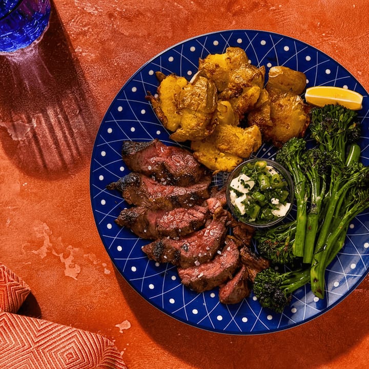 Consegnato fresco a casa tua tra le 10:00 e le 20:00. Bistecca di falda alla griglia strofinata con spezie basche agrumate, servita con patate schiacciate all'aglio, broccolini affumicati e salsa verde di feta e asparagi. Audace e brillante fino all'ultima goccia di limone. Include 1 bistecca con spezie basche per ogni ospite.