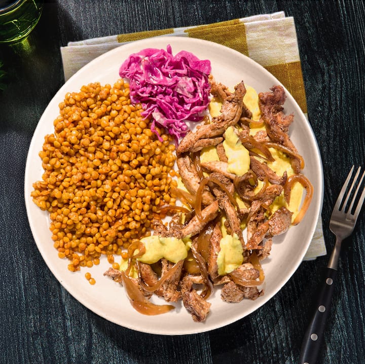 Scopri il pollo speziato con shawarma su couscous israeliano, con cavolo dolce sottaceto, cipolle caramellate e salsa aioli piccante. Una versione frizzante e irresistibilmente fresca del cibo di strada mediorientale. Include 1 pasto a base di pollo shawarma per ospite.