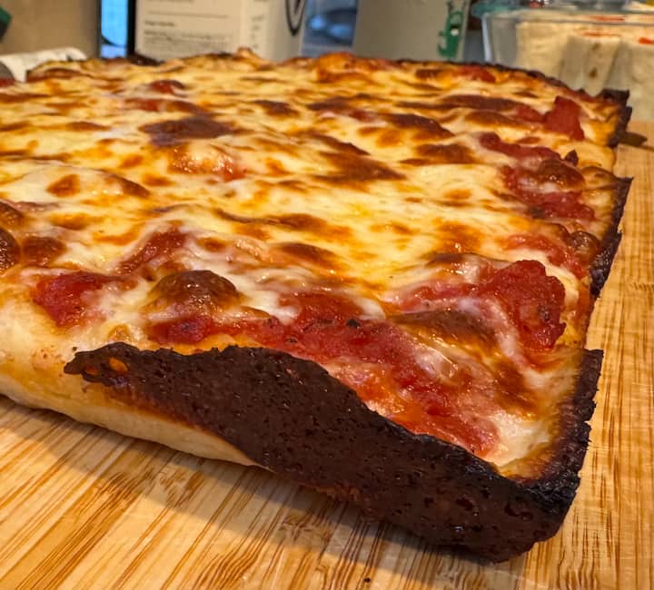 La ricetta di Kenji per la pizza cotta in una teglia di acciaio blu con guarnizioni a scelta, un'insalata di antipasti, un tagliere di formaggi e focaccia.