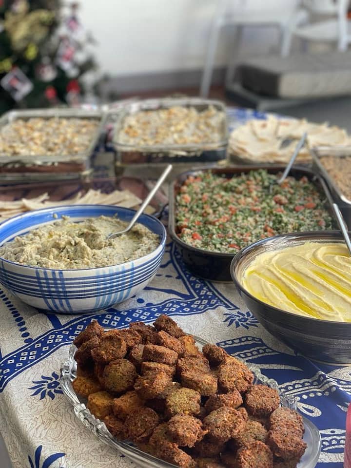 Vassoi di kibbeh, falafel, baba ganoush, hummus, tabbouleh e pane arabo.