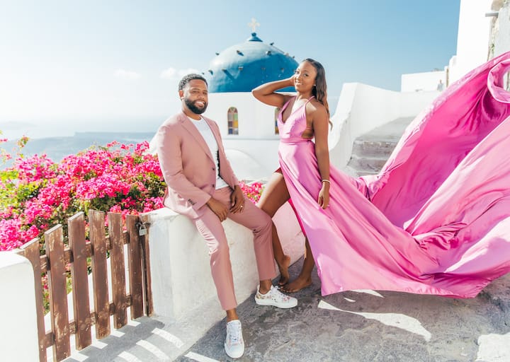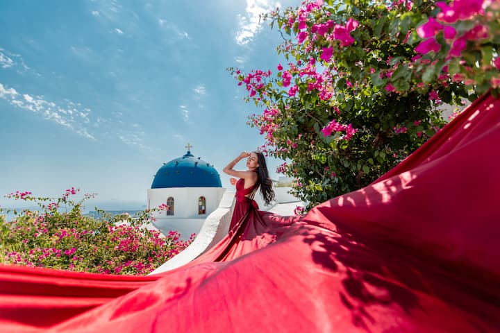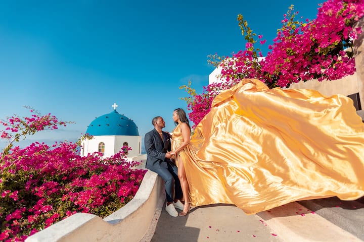 La sessione fotografica si svolgerà a Oia, Imerovigli o in qualsiasi altro splendido luogo dell'isola. L'abito e l'assistente non sono inclusi. Il noleggio dell'abito costa 100 euro, il servizio di assistenza 30 euro