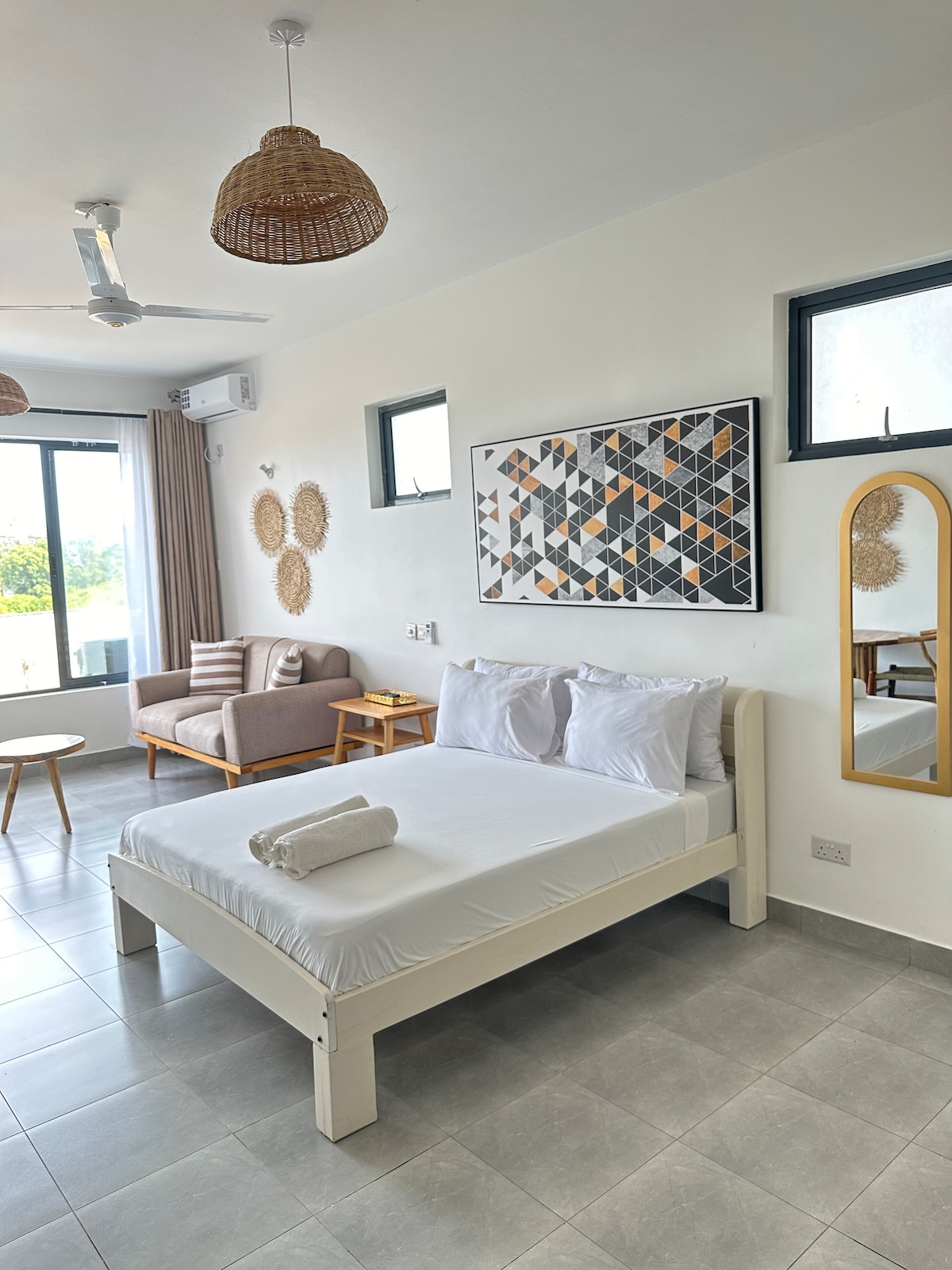Ti diamo il benvenuto ad Angaza House. Un appartamento con 1 camera da letto a Shanzu, in un ambiente tranquillo e sereno con parcheggio, aria condizionata, piscina, ristorante, bar e vegetazione. Si trova a 2-5 minuti in auto da Serena Beach, dal Pride Inn Paradise e dal Flamingo Beach Resort. Angaza è una parola swahili che significa accendere/illuminare. Nato e cresciuto nella città costiera di Mombasa, l'arredamento si ispira alla ricca cultura swahili unita a influenze moderne.