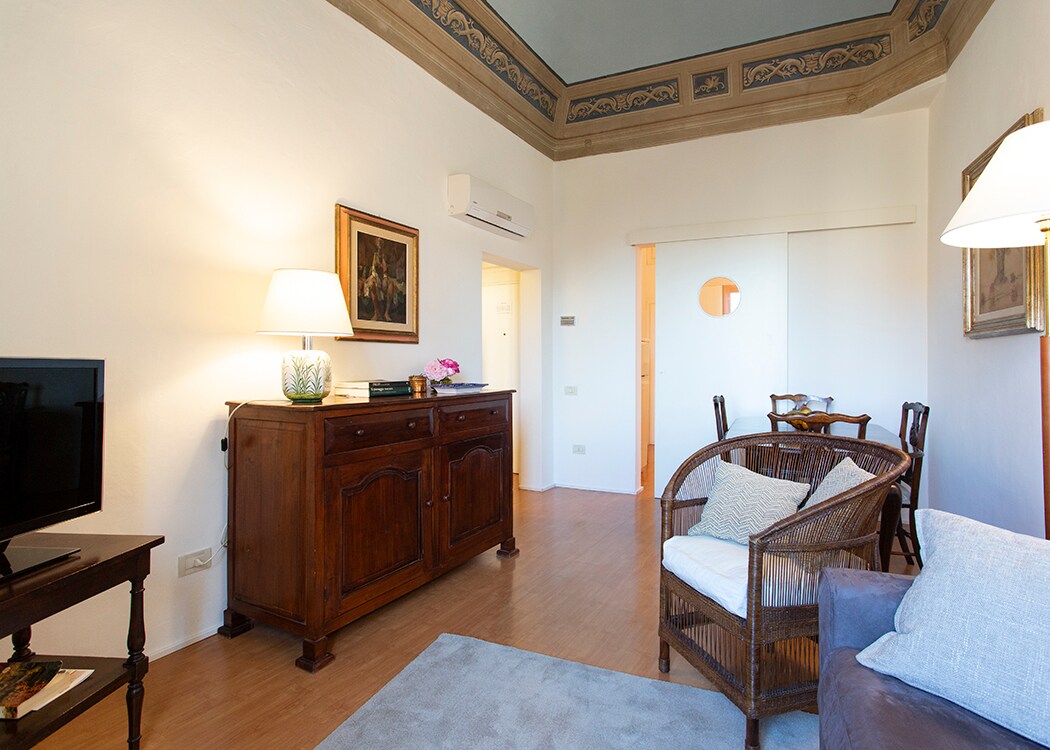 The Palazzo Pannilini Superior apartment is composed of a bright entrance enriched by an elegant coffered ceiling, a large fully frescoed lounge, a large foyer, a kitchen equipped with a terrace, a dining room topped with a frescoed vault, four bedrooms, three bathrooms, a wardrobe room, and a panoramic terrace where you can sunbathe and relax. The apartment is located at the second floor with no elevator. The apartment has air conditioning.