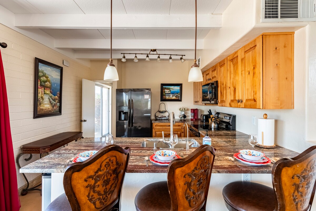 Rifugiati in questa tranquilla casita con 1 camera da letto a West Foothills, situata in una pittoresca proprietà di 17 acri. Goditi un letto king-size, aria condizionata/riscaldamento, cucina completa con acqua RO, macchina per il ghiaccio, forno a microonde, piano cottura/forno, TV Roku da 65" con 220 canali, Wi-Fi veloce, lavatrice/asciugatrice in loco e tavolo da gioco. Circa 74 metri quadrati di comfort e fascino. A soli 3 km da Silverbell Rd, su Ironwood Hill Dr, a 9,6 km dall'Università dell'Arizona. Impeccabilmente pulita e invitante, perfetta per una fuga tranquilla. Licenza AZ TPT 21337578