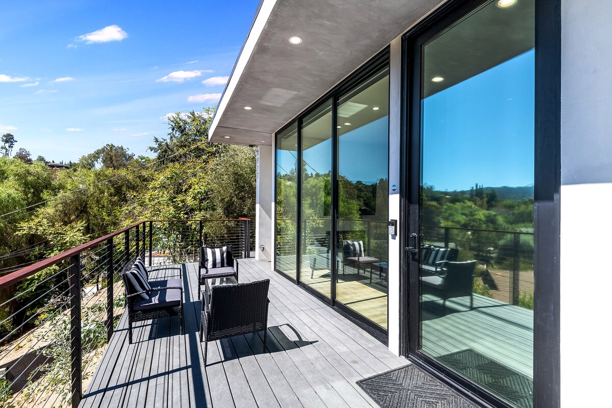 Sali 54 gradini per raggiungere questo spazio unico e rilassante. Questa casa in stile moderno sulle colline di Tarzana dispone di 2 camere da letto, 2 bagni e mezzo con 2 letti matrimoniali e 1 divano letto. Dispone di un patio all'aperto e di una vasca idromassaggio sul balcone. LA CASA SI TROVA IN UNA ZONA A RISCHIO INCENDIO. È ASSOLUTAMENTE VIETATO FUMARE.