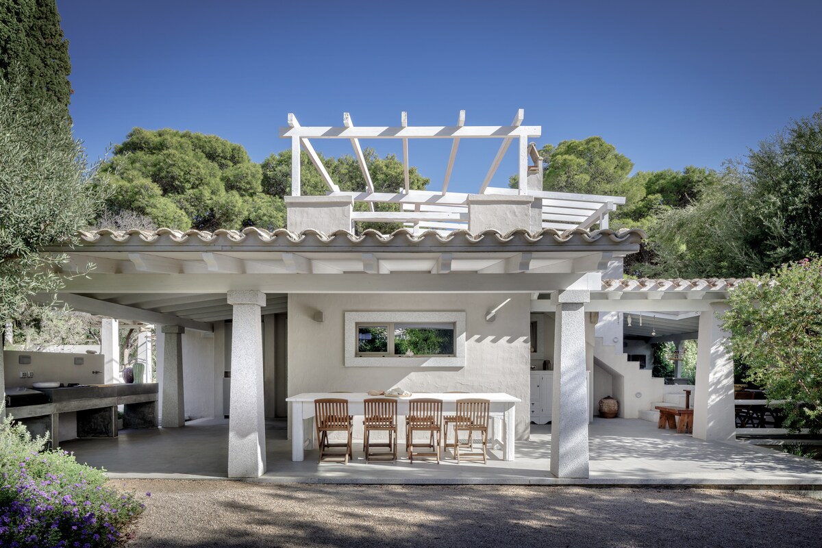 Casa di 120 mq disposti su unico livello, con 4 camere letto e 4 bagni, cucina, sala, ampie verande, e parcheggio interno. Aria condizionata in tutte le camere. Giardino con duna di sabbia, ginepri e prato verde; Adatta a famiglie con bambini e animali da compagnia. Distante 3 km dal paese. A piedi: 5 minuti per la Spiaggia del Riso e Campulongu, 10-15 per spiaggia di Notteri Porto Giunco e porto turistico, 5 per market, edicola, bar, pizzerie e ristoranti.