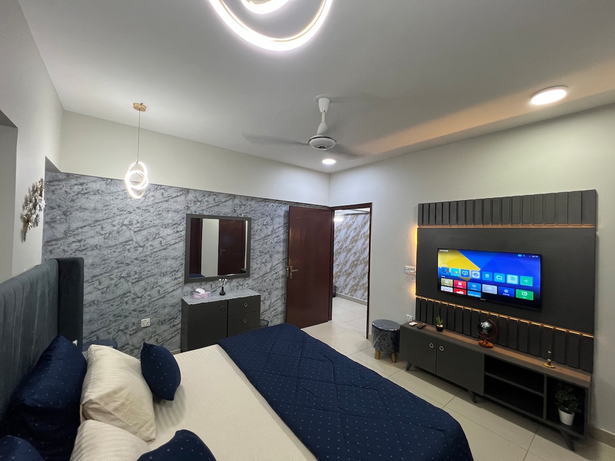 Unwind with Your Family in Our Serene 3-Bed Apartment Escape to our cozy 3-bedroom apartment. - 3 Spacious Bedrooms: 2 master bedrooms with king-sized beds, AC, and smart TVs. One room has a stylish dressing area, third room has single bed, cupboards, Iron stand, dressing table & no Ac. - Amenities: Attached washrooms, 3 shaded LED lighting. - Drawing Room: 5-seater sofa, attached washroom. - Kitchen: Spacious American-style with dining table and brand-new appliances. Unit on 2 floor no lift