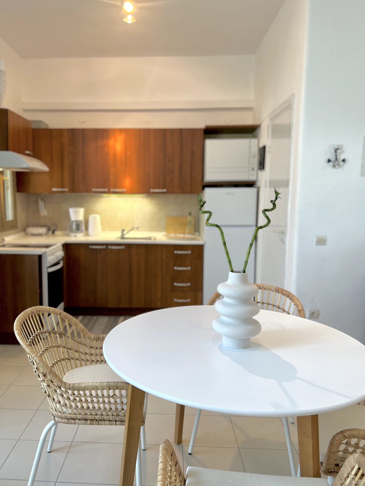 Stylish boho holiday house just 50m from the sea, in a quiet seaside complex in Latoura, Halkidiki. Fully renovated maisonette with 2 bedrooms (double beds), living room, equipped kitchen and modern bathroom. In front of the house there is a large dining table in a shared outdoor area, perfect for meals and relaxing. The beach is a 4-minute walk with calm, crystal-clear waters. Private parking • Wi-Fi • Air conditioning Ideal for couples and families.