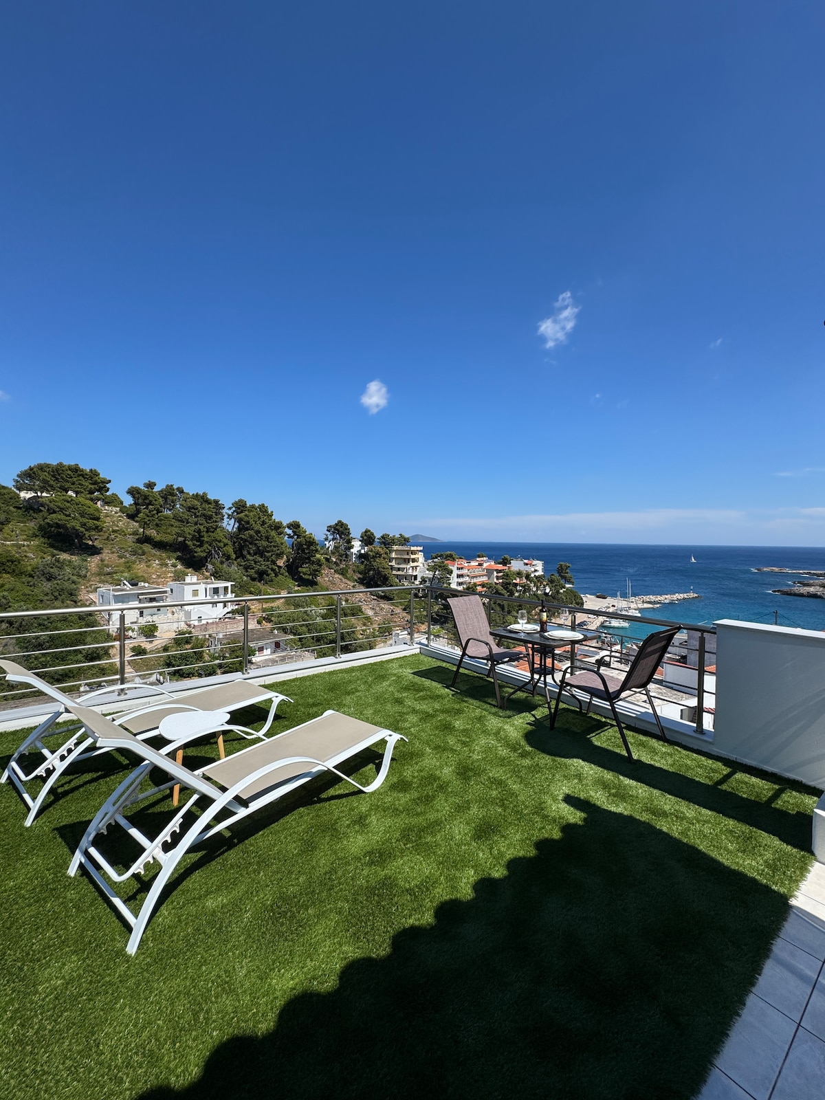 Perfectly situated in the heart of Skiathos Old Port, this newly renovated luxury apartment offers superb accommodation for up to 4 guests. The large, private terrace has a stunning sea view and comfortable furniture for lazy days and relaxed evenings. There are 2 bedrooms, a bathroom and a bright living room with a kitchen area and that fantastic sea view through the picture windows. In front of the apartment is the Old Port with its many tavernas, cafes and bars.