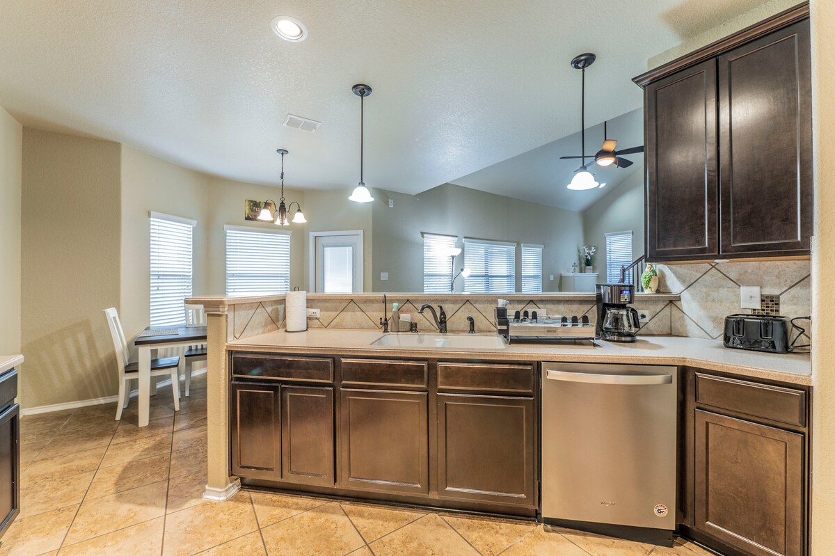 Alloggio 4BR, 2BA adatto alle famiglie nella tranquilla Von Ormy, in Texas. Può ospitare 8 con 5 comodi letti, soggiorno/sala da pranzo/cucina aperta e una suite principale privata. Goditi un ampio cortile sul retro per giocare a calcio o semplicemente goderti il sole del Texas. Un garage per 2 auto aggiunge ulteriore comodità durante il soggiorno. A breve distanza in auto dalle attrazioni di San Antonio, come la River Walk e SeaWorld, perfetto per famiglie o gruppi in cerca di comfort e comodità!