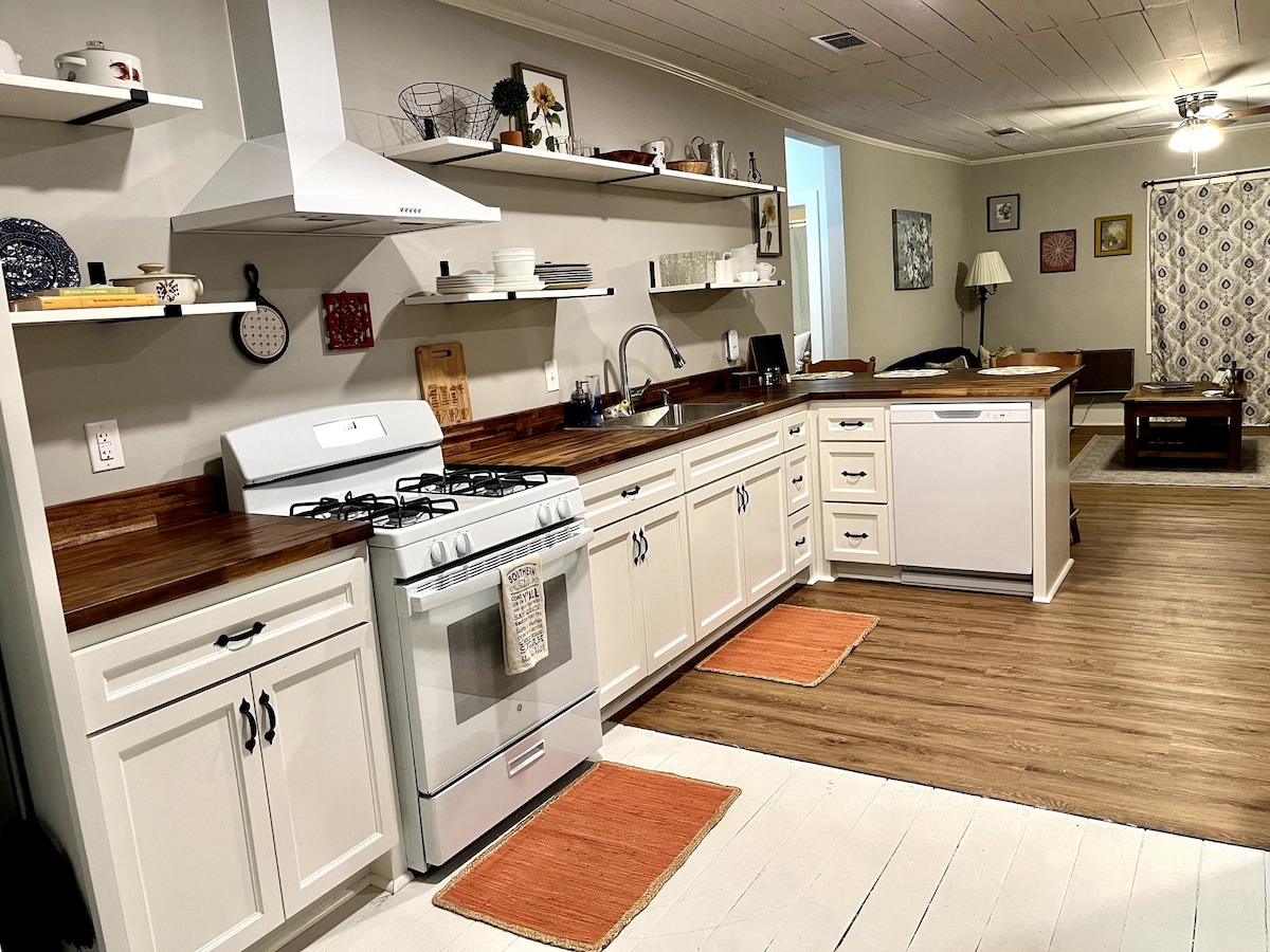 Two miles from the interstate, The Barn is on three acres of peaceful private property. As you pull on to our road The Barn is to the left of our home. Parking signs are clearly marked. The Barn - Downstairs is a 600 square foot efficiency apartment with a comfortable king size bed, a kitchenette, a den area with a queen size sofa sleeper, a bathroom with a shower and a 55” TV that swivels. Amenities include a patio, a charcoal grill, a fire pit, a pond for fishing, and a nature trail.