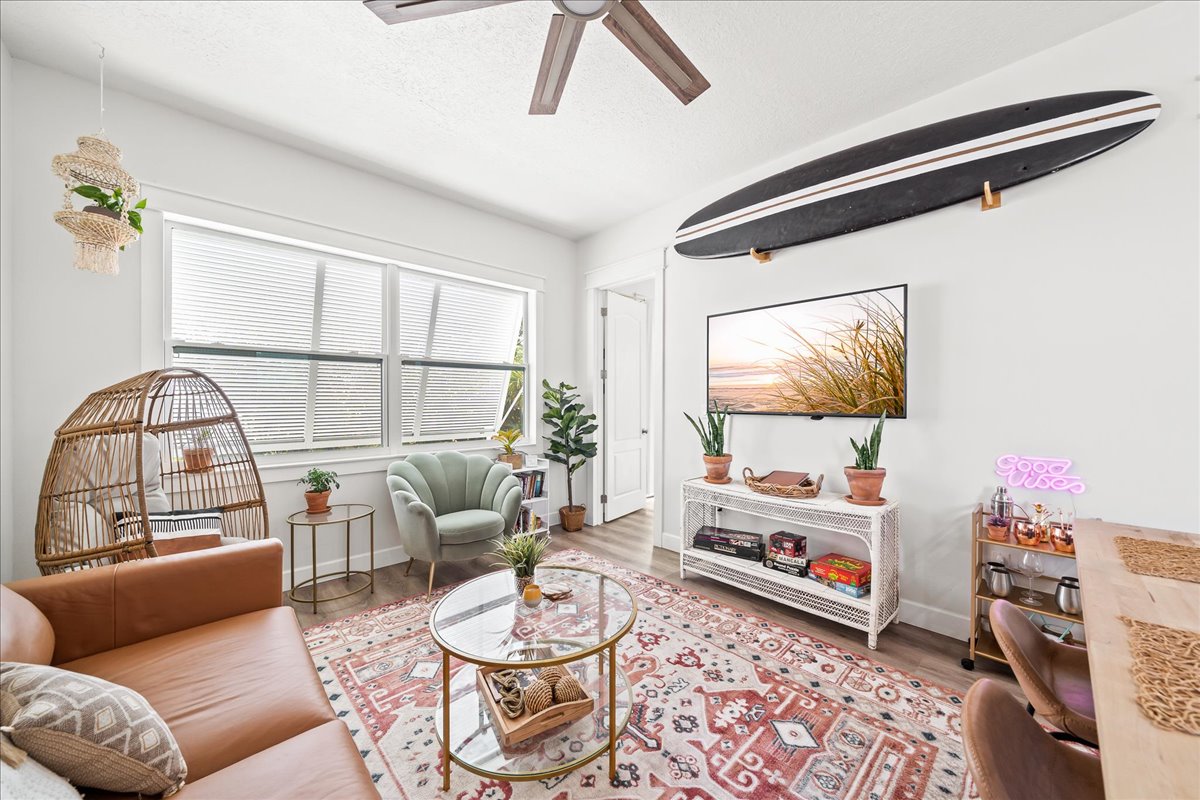 Delicious & cozy 2 bed/2 bath/ kitchen & living/dining-combo intentionally designed for a pampering stay. 1 King bedroom & 1 queen bedroom, with high-end mattresses & bedding. Queen bedsofa in Living room, 1 fold out bed for a child and 1 Pack n Play. 4K TV's in all rooms, high speed internet. Front Porch & screened back porch. Fully equipped kitchen. 12-15 min walk to the beach (4 min drive & easy parking) 30 min to Kennedy Space Center, 60 min to Orlando & theme parks