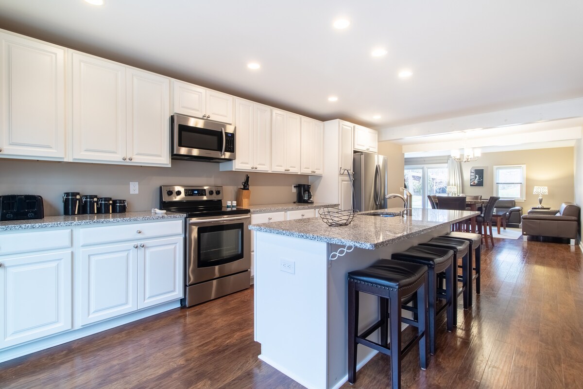 Goditi il tuo soggiorno in questa meticolosa casa coloniale del 2003 con 4 camere da letto, 2 bagni e mezzo, in un ambiente simile a un parco, a 2 minuti a piedi dal lago e dai moli di Candlewood. Un cortile con focolare, parco giochi, trampolino, casa sull'albero e piscina termale di 5,8 metri. Camera da letto principale con letto king-size; camera degli ospiti con letto matrimoniale; camera dei bambini 1 con letto matrimoniale e letto a castello; camera dei bambini 2 con letto queen-size. Se ti interessa portare più ospiti durante i mesi estivi, consulta il nostro appartamento aggiuntivo. airbnb.com/h/addonapartment