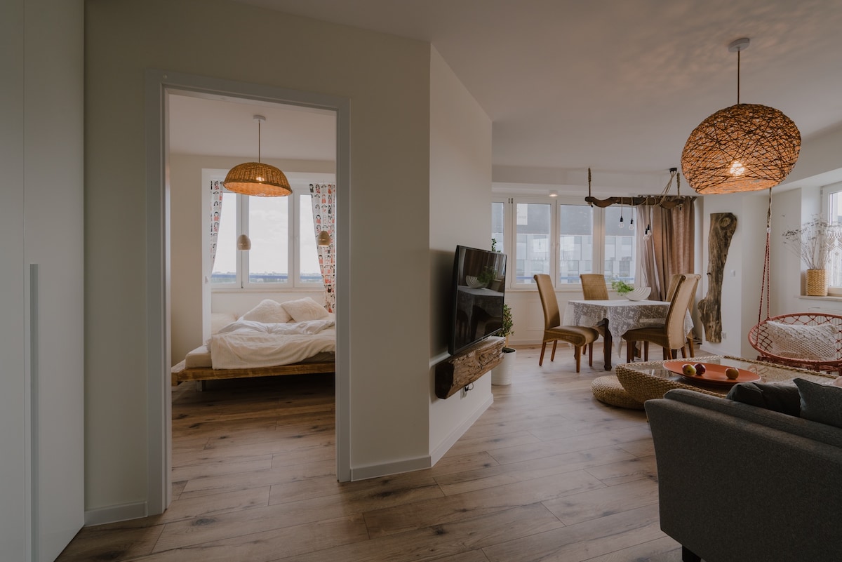 Moderno appartamento con vista sullo skyline occidentale della città. Un luogo unico con una splendida terrazza all'ultimo piano offrirà una vista indimenticabile. L'appartamento è composto da un soggiorno con angolo cottura completamente attrezzato, una camera con ampio guardaroba, un bagno e una terrazza. Hai tutti gli articoli necessari: un bollitore, un ferro da stiro, un'asciugatrice, capsule per il bucato, caffè, tè, spezie di base. L'appartamento è perfetto per le visite turistiche del fine settimana e per i soggiorni più lunghi.