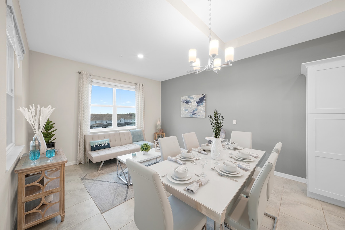 Goditi la tua vacanza da sogno in questa bella ed elegante casa a schiera vicino a tutti i parchi Disney. Progettata per essere la tua casa lontano da casa! Ogni dettaglio è stato attentamente pensato per offrirti un'esperienza a 5 stelle! Gli ospiti possono rilassarsi e ricaricarsi su un letto matrimoniale grande Tempur-Pedic per un sonno olistico. Divertiti e rilassati presso la clubhouse, che offre una piscina riscaldata e altri servizi. La nostra villa unica è il posto perfetto per le famiglie che vogliono godersi i parchi e la splendida città di Orlando!