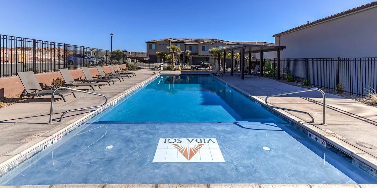 Brand New townhome is located 36 miles to Zion's National Park, and features a private outdoor hot tub, fire pit, and a heated pool! The quiet Vida Sol community is located only 2 minutes off of I-15 and 5 minutes to the St George outlet stores and Walmart/Costco. Mountain biking, walking trails and two parks nearby. ✓Private hot tub 🏊Heated Pool (Shared, heated year-round) 🛏️3BR/3BA 🛋️2 Living Rooms 👨🍳 Chef's kitchen 📶Fast/Free internet 📺Smart TV's ❄️AC 🔥Fire pit 🍖Grill 🛀Big bathtub