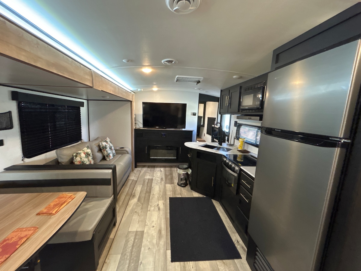 Che tu sia qui per una vacanza al mare, una fuga sulla neve o un ritiro di lavoro da qualsiasi luogo, questa lussuosa quinta ruota offre tutti i comfort di casa, con un tocco unico. • Interni in stile residenziale con soffitti alti, mobili di dimensioni standard e molto spazio per distendersi • Una cucina completamente attrezzata con elettrodomestici moderni, perfetta per cucinare a casa • Accogliente soggiorno con sedie reclinabili, grande TV e un camino per il massimo comfort • Bagno completo con cabina doccia