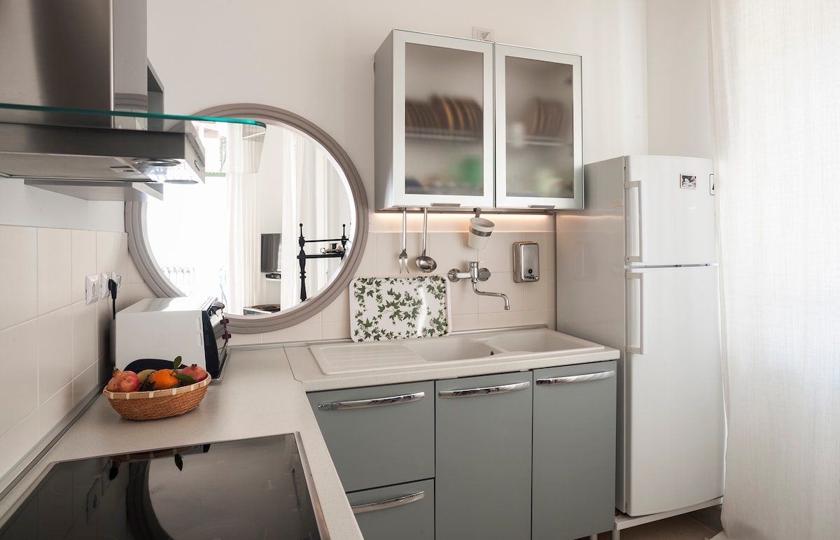 L'appartamento, completamente attrezzato, ha accesso diretto alla baia e si affaccia sul blu del mare Ionio. Avvolto dalla terrazza circondata da aiuole ricche di vegetazione autoctona, l'appartamento possiede una cucina con vista mare da oblò, un bagno (con doccia e vasca) ed una stanza da letto matrimoniale. E' arricchito da arredi in stile anni ’60 e ’70; mobili di famiglia recuperati e restaurati con passione e cura del dettaglio. La posizione strategica di Stazzo permette di raggiungere in poco tempo punti di interesse quali l’Etna (46 minuti), Taormina (33 minuti) e la città di Catania (29 minuti). In paese, raggiungibile in pochi minuti a piedi, sono presenti due minimarket, un panificio, un macellaio, un bar, due ristoranti e una pizzeria. La seconda domenica di Agosto il paese festeggia il santo patrono, S. Giovanni Nepomuceno, cui è dedicata la Chiesa della Piazza Centrale. Durante tutto l’anno il luogo presenta un magnifico paesaggio di mare, che d’estate si distende in giornate soleggiate, mantenendosi calmo o poco mosso, e il cui colore blu contrasta con la nera scogliera vulcanica.