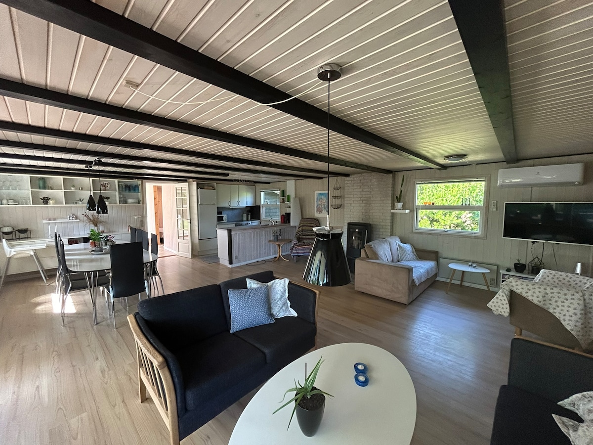 Immerso nella natura, accogliente grande casa estiva appena ristrutturata in zona tranquilla. Ti piace la spiaggia, la foresta, la vita da resort, la mountain bike, il golf, il padel, il Fårup Sommerland o semplicemente un viaggio lontano da tutto? Ecco qualcosa per tutti. La casa è mantenuta in stile originale con spazio e aria per vacanze con un massimo di 2 famiglie (9 ospiti). Qualunque sia il tempo, puoi goderti la doccia all'aperto, la vasca idromassaggio, la vasca con acqua fredda e la sauna. Casa, annesso e posto auto coperto creano riparo e sono collegati da una terrazza in legno e un piccolo prato con la possibilità di varie attività all'aperto.