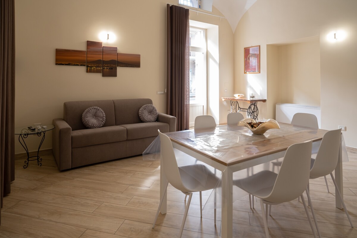 Qui le giornate scorrono lente, ai piedi del Monte Verde, tra luce naturale, silenzio e viste sul Vesuvio. Il secondo piano di una villa storica immersa nel verde di Angri accoglie gli ospiti con spazi ampi, arredi d’epoca originali e ambienti luminosi. 150 m² con tre camere indipendenti, due bagni, una cucina e un soggiorno dove rilassarsi dopo le escursioni. Dal balcone lo sguardo si apre sul Golfo di Napoli. Una base ideale per esplorare la Campania e rientrare ogni sera in tranquillità.