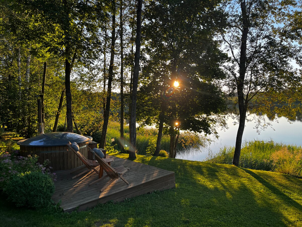 Situato sulle rive del fiume Dubinga, il cottage vacanze è luminoso ed elegante, con vista sul fiume Dubinga e sulla foresta. Questo lodge vacanze dispone di sauna, vasca idromassaggio (a pagamento), terrazza, aria condizionata, area spiaggia privata, braciere, grill all'aperto, canestro da basket, area picnic e parcheggio gratuito. Durante il soggiorno, potrai pescare, fare kayak, escursioni, andare in bicicletta, giocare a basket e dedicarti a varie altre attività.