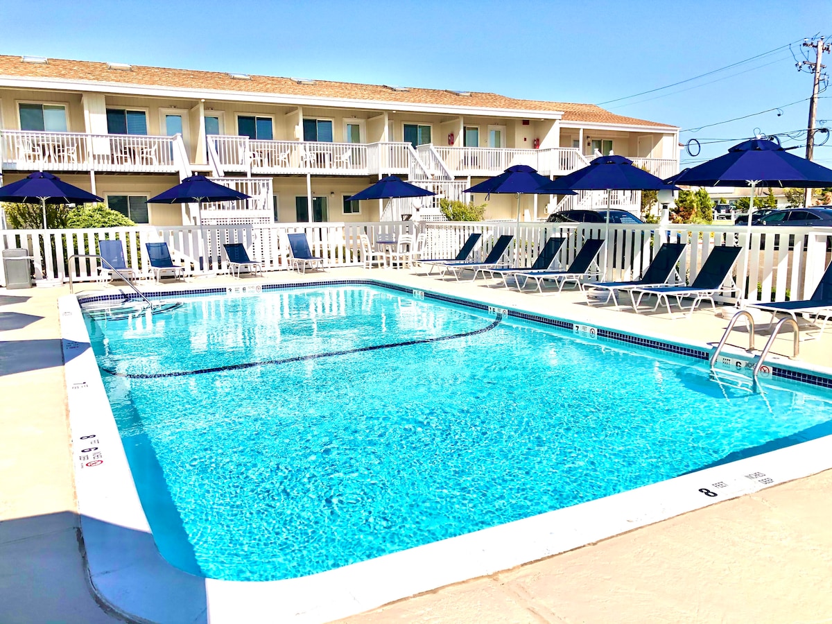 My cute one-bedroom suite is at Royal Atlantic Beach Resort North, with the beach just across the street! The resort features two pools—one just outside the room and another oceanfront with a tiki bar. Other amenities include a game room, a BBQ area (just bring charcoal and fluid), and poolside bed loungers. It's all about location, with the village just a block away. You are steps away from restaurants, shopping, bars, and lots of family activities. Location, location, location!