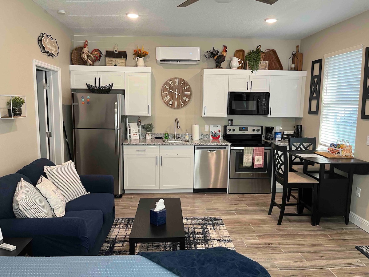 Vicino all'estremità nord di Villages, vicino alle autostrade 441/27 e 42. Nuovissimo monolocale del 2023 con patio privato in mattoni che si affaccia su un grazioso cortile con alte querce. Cucina completa, nel caso in cui tu abbia voglia di cucinare, e bagno moderno con cabina doccia e zona lavanderia. Wifi gratuito e TV con i tuoi canali di streaming preferiti. Quartiere tranquillo per famiglie con posto auto privato. Viviamo nella proprietà, per qualsiasi necessità. Ti diamo il benvenuto nel nostro paradiso!