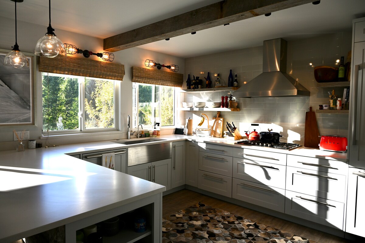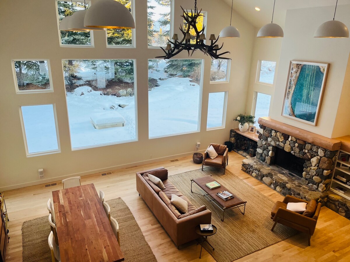 Enjoy this peaceful setting in Ketchum+Beautifully RENOVATED Home - Ski/bike/hike/off-road by day and hot tub and relax in the comfy furnishings and warm fireplace. The 36 mile Wood River Trail just outside your door. 3 miles to River Run Lodge and Hailey. The fully stocked kitchen, master and living space on top floor is open, light-filled space in treetops. See details of our newly remodeled downstairs, GYM/Yoga Studio or bedroom configuration upon booking. Perfect t for 2 couples.