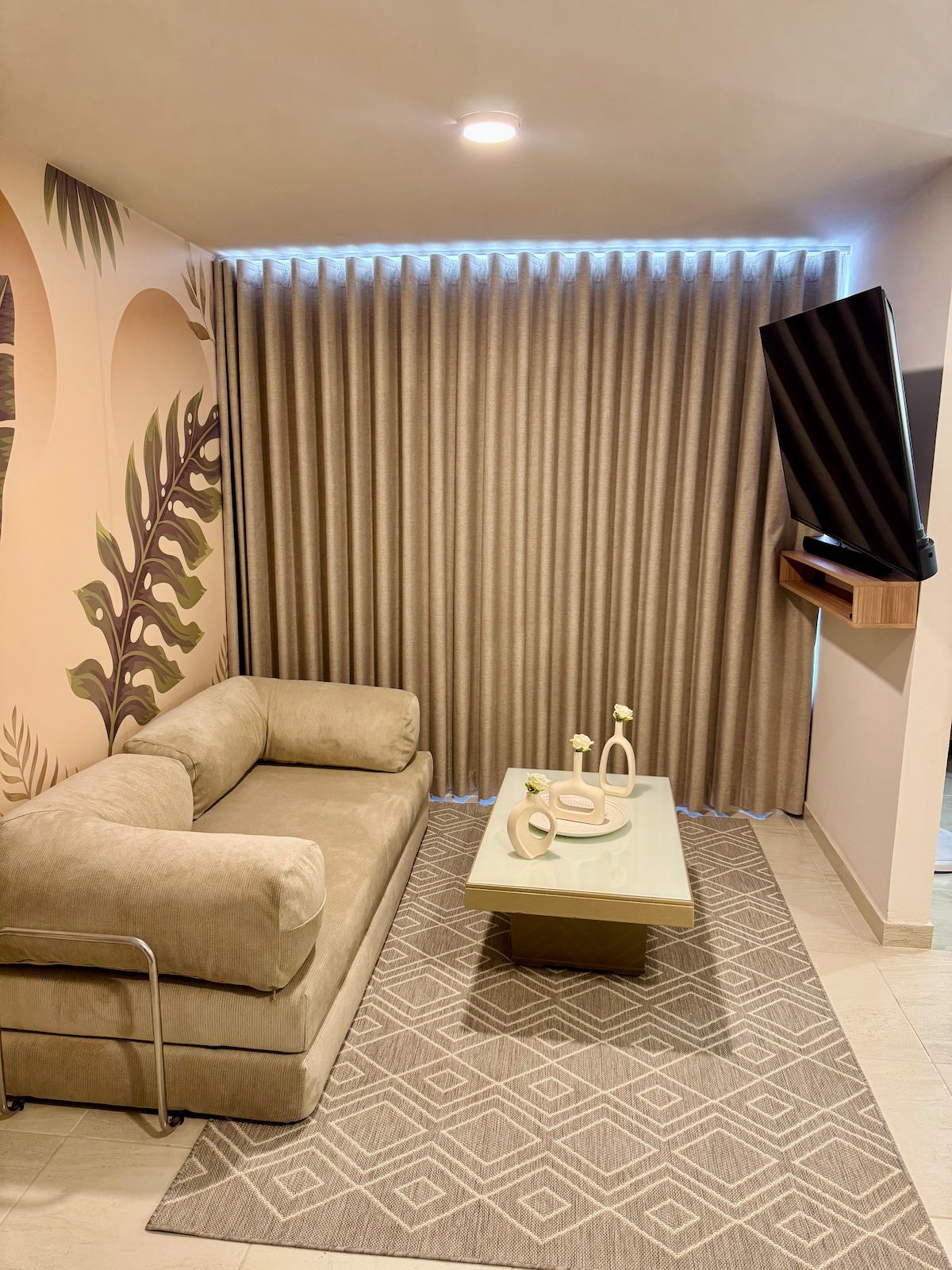Moderno appartamento situato in uno dei quartieri più esclusivi di Barranquilla. * Check-in e check-out flessibili *1 camera da letto con letto matrimoniale e aria condizionata. *Soggiorno con divano letto e aria condizionata. *Cucina completamente attrezzata con utensili, elettrodomestici di base e lavatrice. *Piscina, sauna, bagno turco e terrazza sul tetto. * Palestra Smartfit nelle vicinanze. *Parcheggio privato gratuito. *Vicino ai centri commerciali VIVA e Buenavista, e alle principali cliniche e zone turistiche.