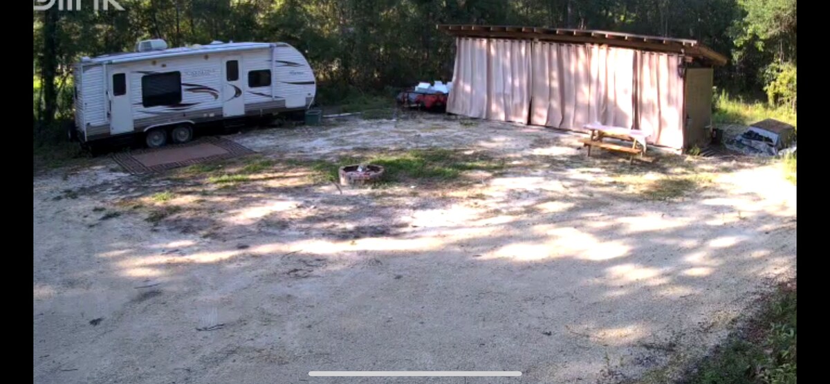 Wifi now available. Reconnect with nature at this unforgettable escape. 10 acres with 800' on the Historic Suwannee River with a 20' floating dock to enjoy the river life with out the crowds. Phase 1 of raised boardwalk complete, now walk from the camper over to the dock in a few minutes.. Come get away from the crowds 3 miles down a private road where the only traffic you will see will be on the river. Bring your boat, kids and pets. Camper is a 2016 Avenger.