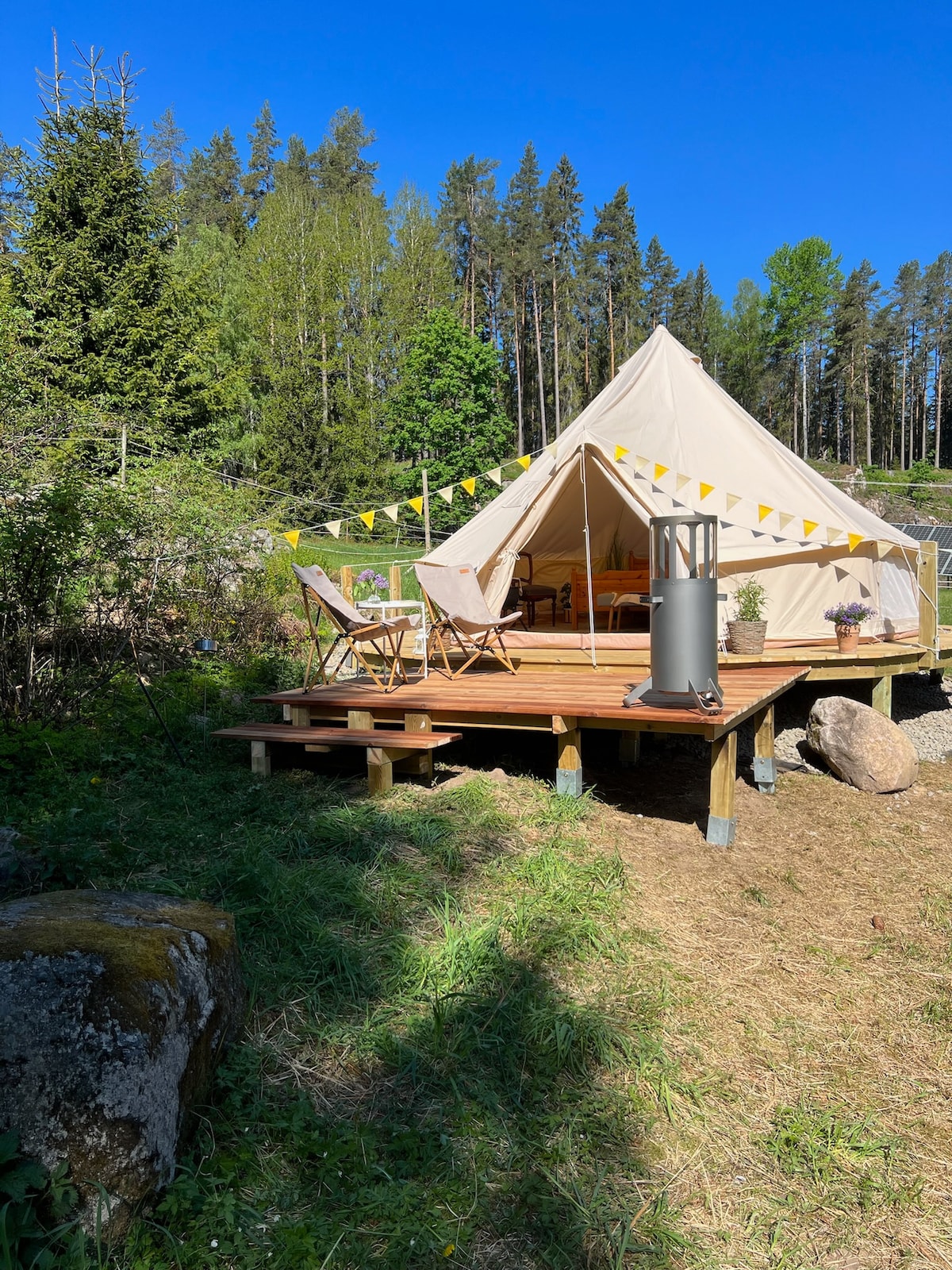 Glamping = a perfect combination of wilderness and comfort. Get a break from the city stress. Smell the flowers, listen to the birds singing, breathe fresh air and spend time together without any distractions. Stay close to nature, but enjoy the luxury of a warm bed and a fully decorated space to hang out in. We are located on the Swedish west coast, in the middle of the forest, but only a few minutes away from the beach. Bookable nights for 2026 are now available.