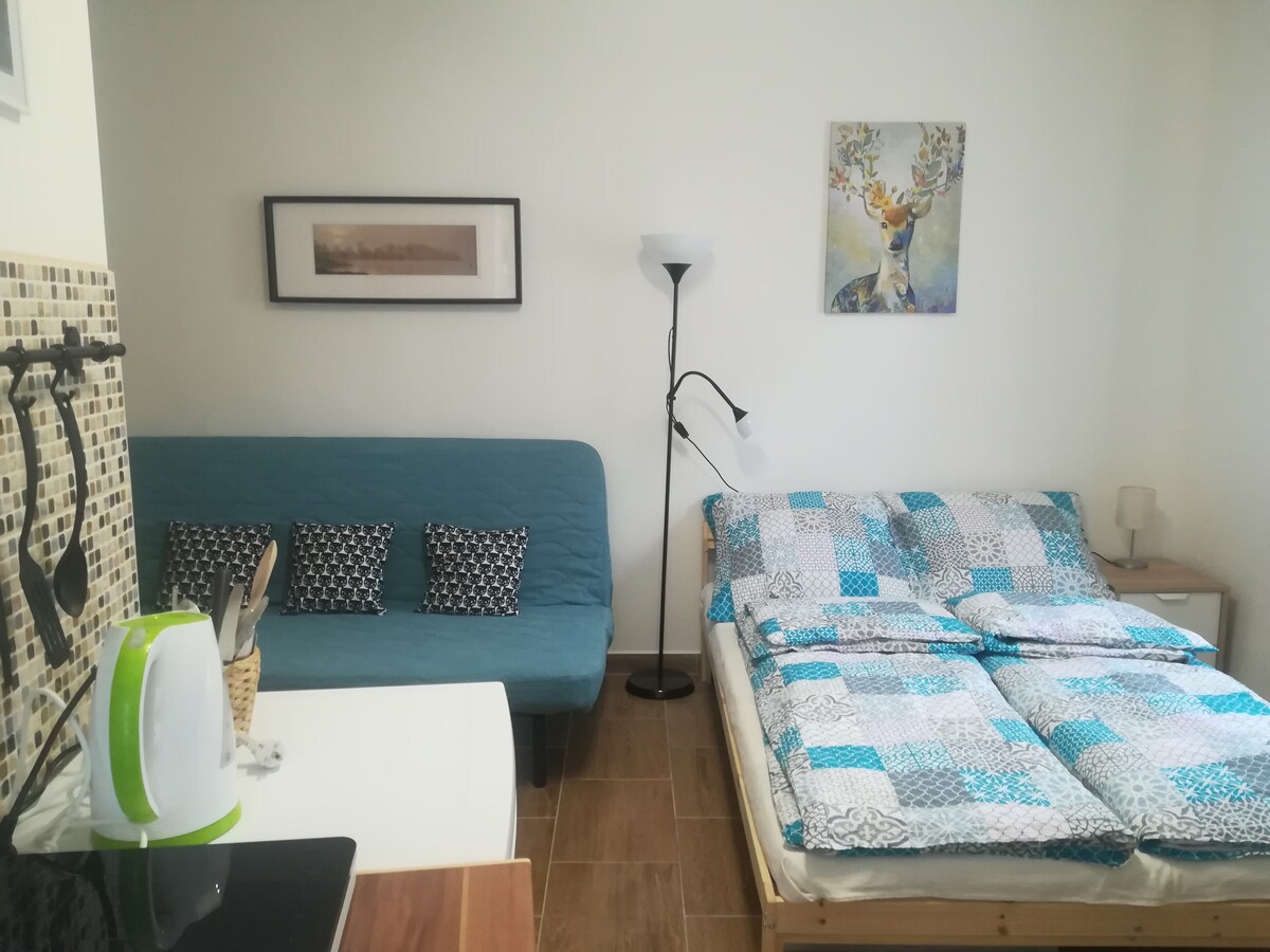 Ideális kis kuckó egy párnak vagy egy személynek akik idelátogatnak munka vagy családlátogatás, más programok miatt. Teljesen központi 1 hálószobás lakás ahonnan gyalog minden elérhető, a buszpályaudvartól 1 percre. A hálószobából nyílik a kis mosdó zuhanyzóval, így inkább 1-2 embernek kényelmes, wc külön van. Másik helyiség egy nappali konyhával egyben, edényekkel, tányérokkal, hűtővel, tűzhellyel felszerelve. Itt van egy kihúzható kanapé ahonnan lehet tévézni de 1-2 gyerek is elfér aludni.