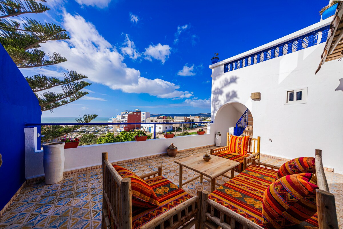 Évadez-vous dans notre appartement lumineux pour 4 personnes avec une vue imprenable sur l'océan. Profitez d'une grande terrasse privée avec barbecue et foyer, parfaite pour admirer les couchers de soleil. Situé dans un quartier calme, à quelques pas de la plage et des spots de surf. Idéal pour les couples et les amis, cet espace unique allie confort moderne et charme marocain avec ses deux chambres douillettes et son espace de travail dédié. Une escapade inoubliable vous attend.