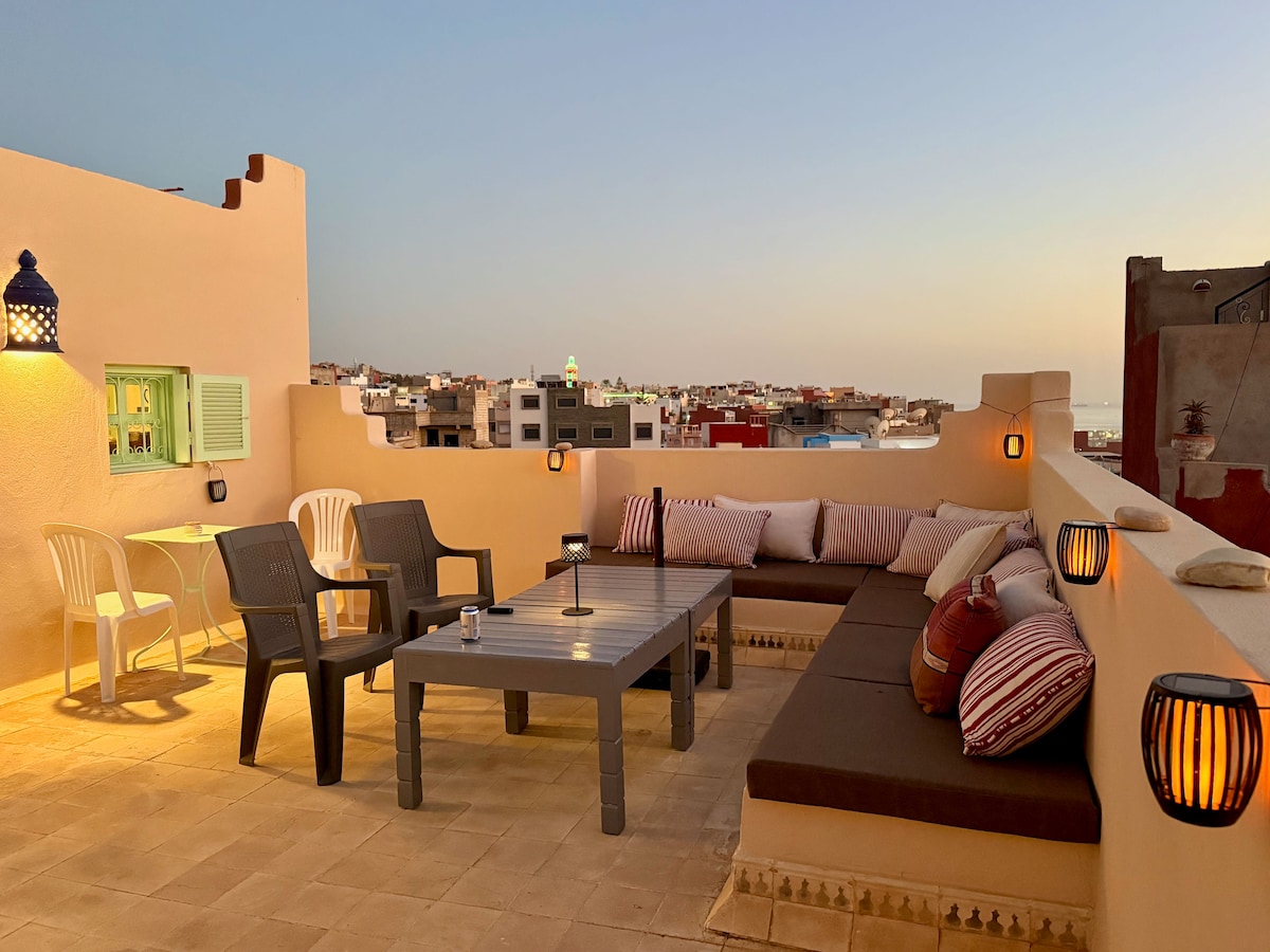 Splendida casa a 3 piani "Dar Diafa" con vista sull'oceano e caminetto, situata nel cuore di Taghazout. A un minuto dalla spiaggia, dai migliori ristoranti con vista sull'oceano e cibo delizioso. Svegliati con vista sull'oceano, ammira gli affascinanti tramonti sull'Atlantico, trascorri serate accoglienti accanto al caminetto e goditi i dettagli autentici dell'arredamento in una casa che ti offre spazio, comfort e privacy.
