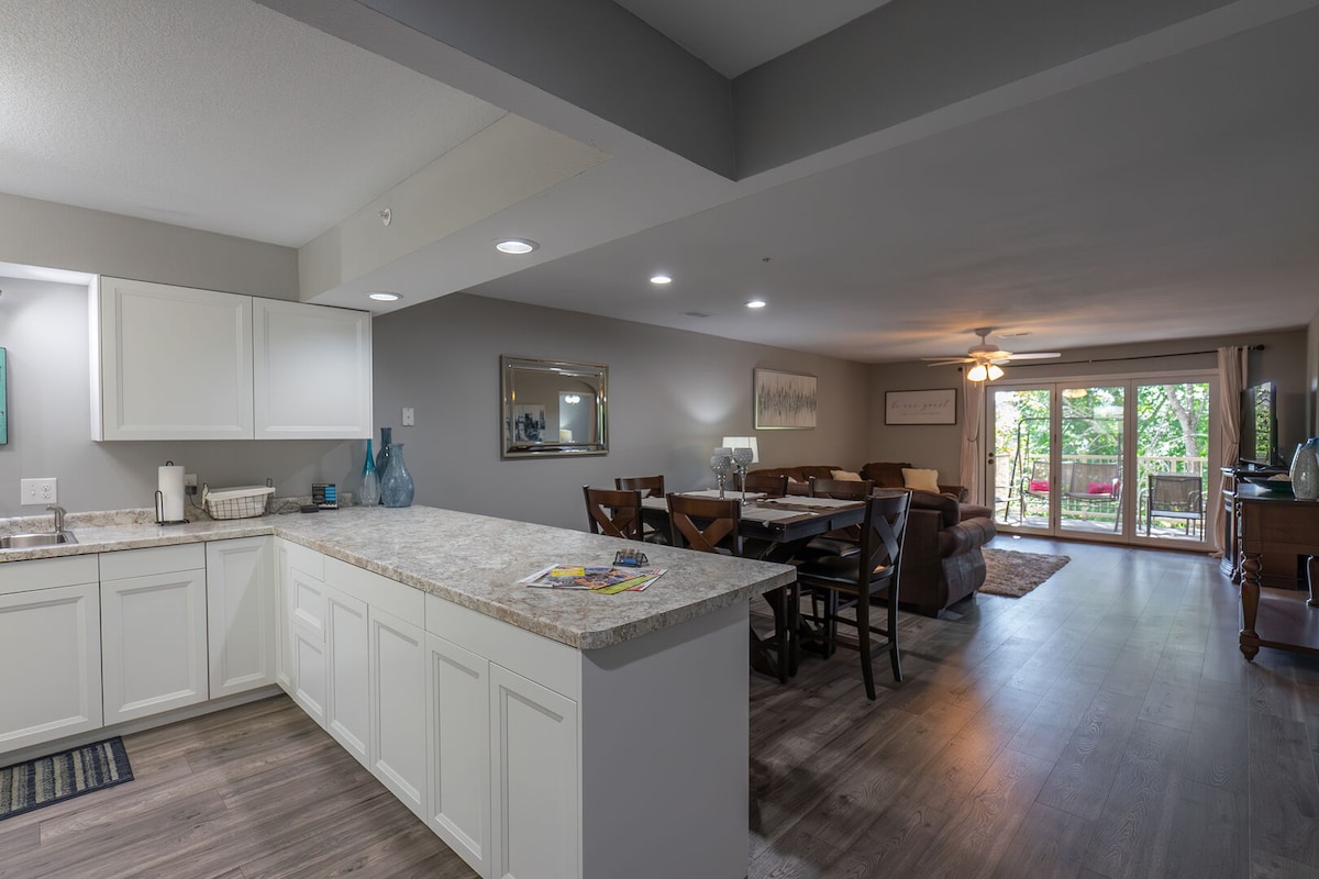 Our spacious 2 bed/2 bath ground level condo is just minutes away from top attractions. Enjoy the Indoor & Outdoor pools, hot tub and sauna. Easy access to the 76 Strip, Branson Landing, Silver Dollar City & Table Rock Lake. The unit has a washer & dryer, well-stocked kitchen, jetted tub, and a veranda with seating for 6. Stay entertained with high-speed internet, 55” TVs with streaming services, board games, and children’s books. The perfct place to rest, relax and create lifelong memories.