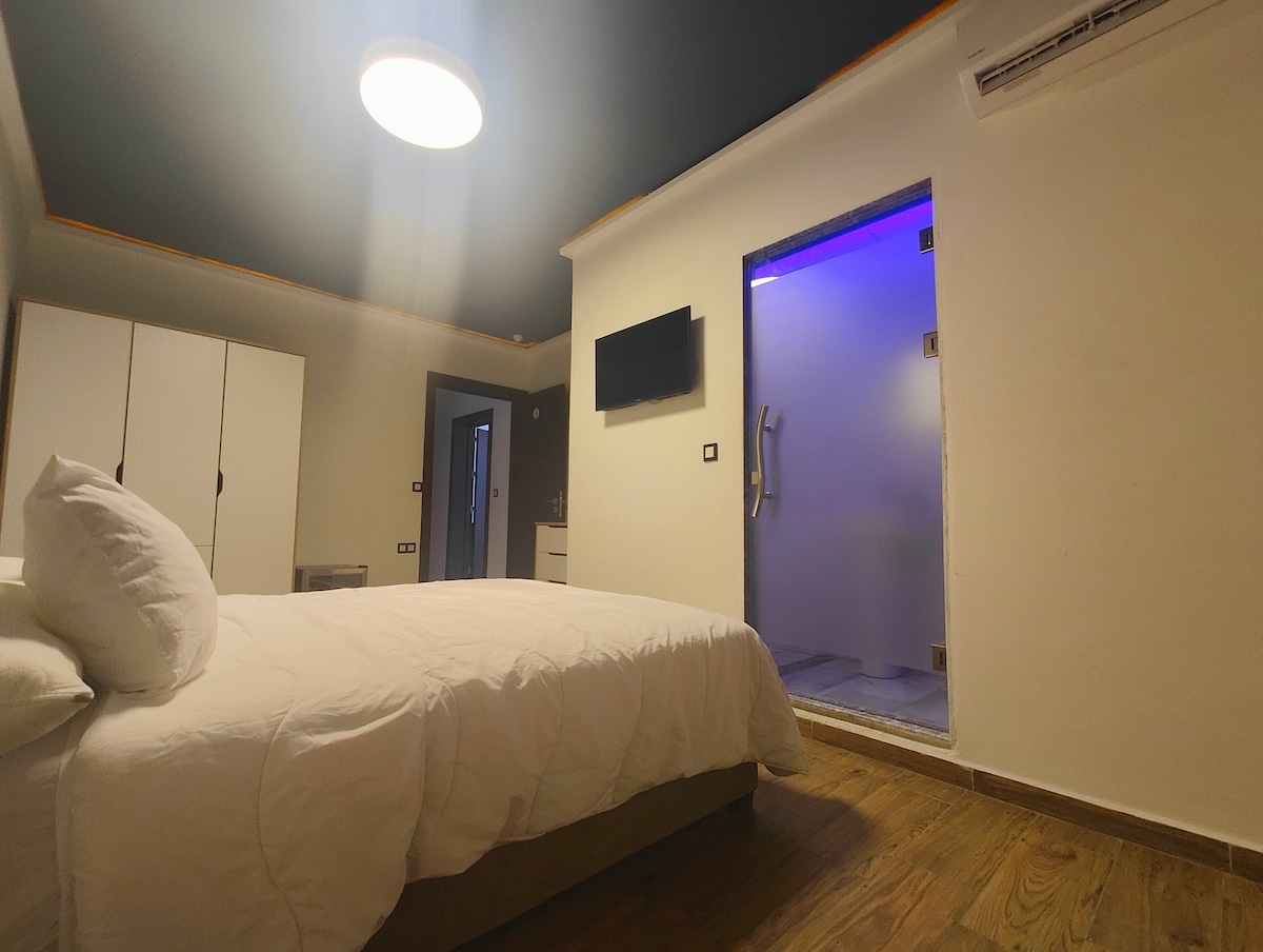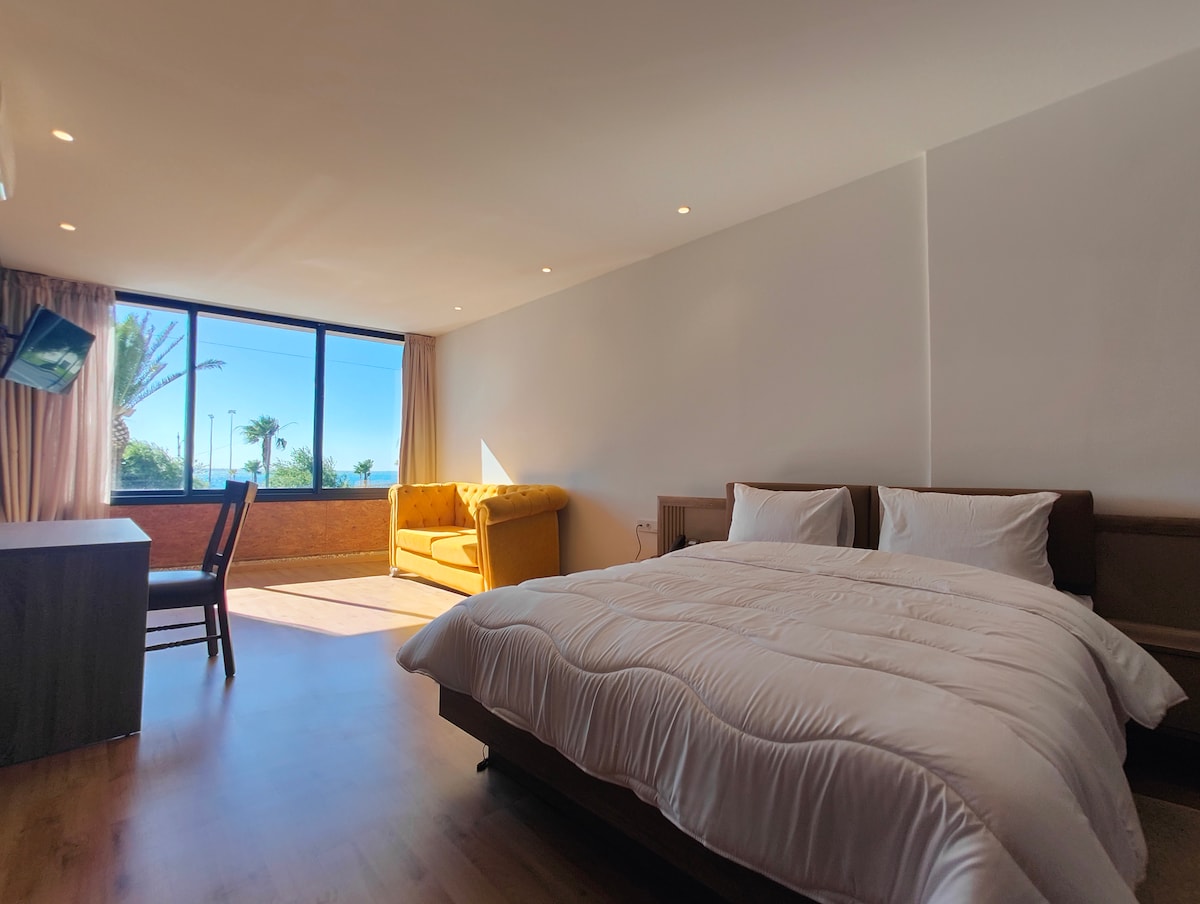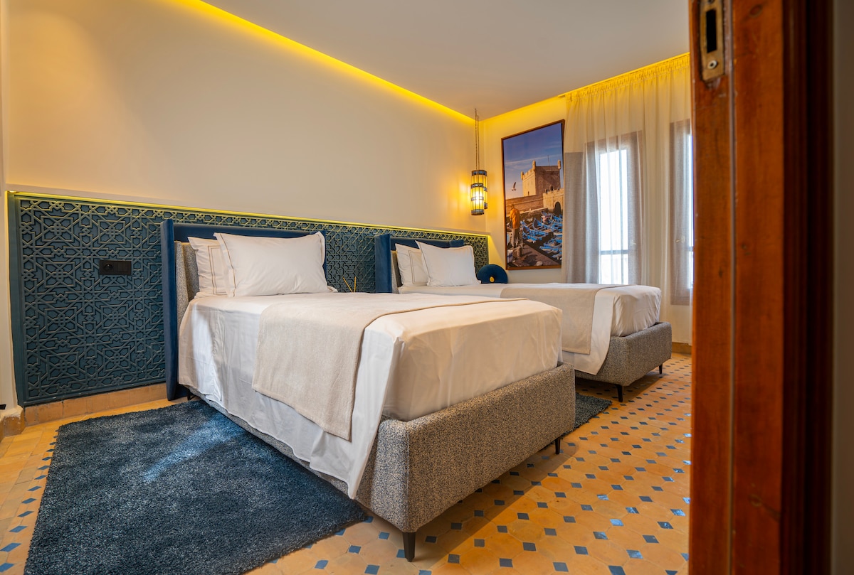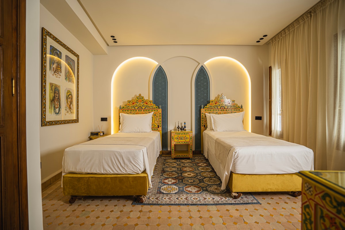 Benvenuti nella nostra Suite con 2 letti singoli al Villa Mirasol Hotel, situato sulla spiaggia di Malabata, Tangeri. Questa elegante suite offre due comodi letti singoli, un moderno bagno privato e una splendida vista sull'oceano dalla terrazza condivisa. Rilassati con servizi di prim 'ordine, tra cui TV e aria condizionata. Goditi la nostra caffetteria/ristorante interno, il servizio di lavanderia, i trasferimenti aeroportuali e il noleggio auto. Esplora la vivace vita notturna di Tangeri, assapora la cucina locale e visita attrazioni come le grotte di Ercole e Cap Spartel.