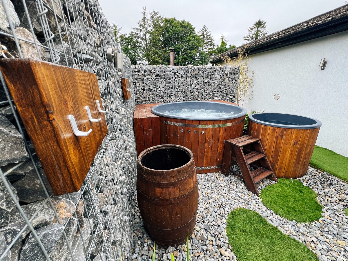 Situato a 5 minuti dalla storica città di Abbeyleix, nella contea di Laois, Villa Jokubas è un villaggio di capanne di legno situato su una collina che domina la campagna circostante. Tutti i nostri chalet combinano finiture moderne e fascino rustico della contea. Goditi tutti i lussi moderni all'interno e all'esterno, un ampio cortile, aree patio coperte con moderne vasche idromassaggio private, griglie per barbecue "Kamado" e un bar completamente rifornito con spine della nostra birra IPA fatta in casa. Addebitiamo 25 € per l'uso della vasca idromassaggio o della sauna. Una bevanda è inclusa.