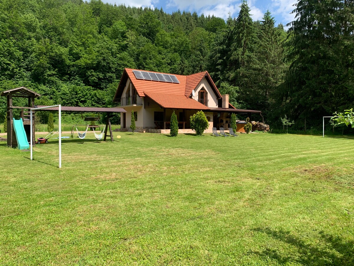 La casa è composta al piano terra da ampio soggiorno, camera da letto con bagno privato, cucina attrezzata, wc, terrazzo esterno con barbecue e zona pranzo, vasca con acqua riscaldata e idromassaggio( la vasca al costo di 300 lei/un giorno o 400 giorni in più) Al piano superiore ci sono 3 camere con letti matrimoniali e bagno privato ciascuna, in 2 delle camere da letto sono letti singoli aggiuntivi e un materasso al piano di una delle camere.
