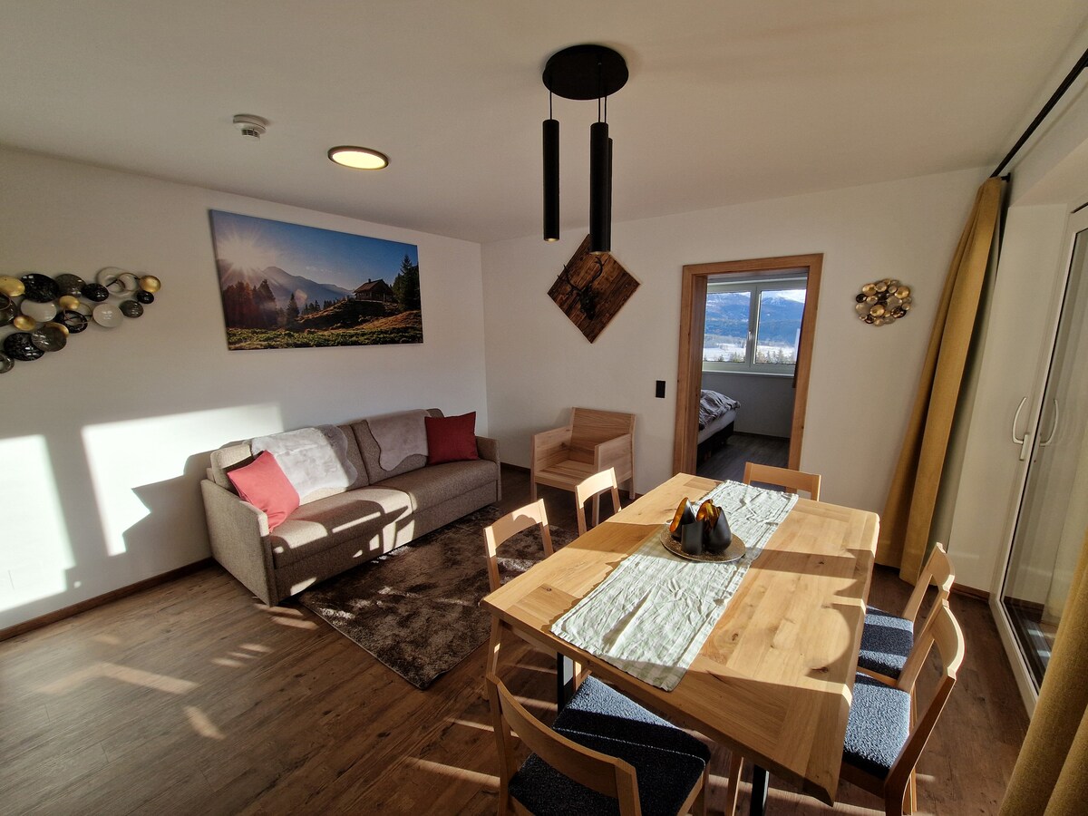 Questo bellissimo appartamento per le vacanze è per veri amanti della montagna e amici dello stile di vita alpino.<br>Su quasi 80 m², offre comfort e spazio per un massimo di 6 persone. Il legno chiaro e le grandi finestre panoramiche vi faranno sentire a vostro agio. L'appartamento vacanze offre 2 camere da letto con letti matrimoniali grandi e un posto dove dormire sul comodo divano nella zona giorno aperta. La cucina a vista è dotata degli elettrodomestici più moderni e di tutti gli accessori.