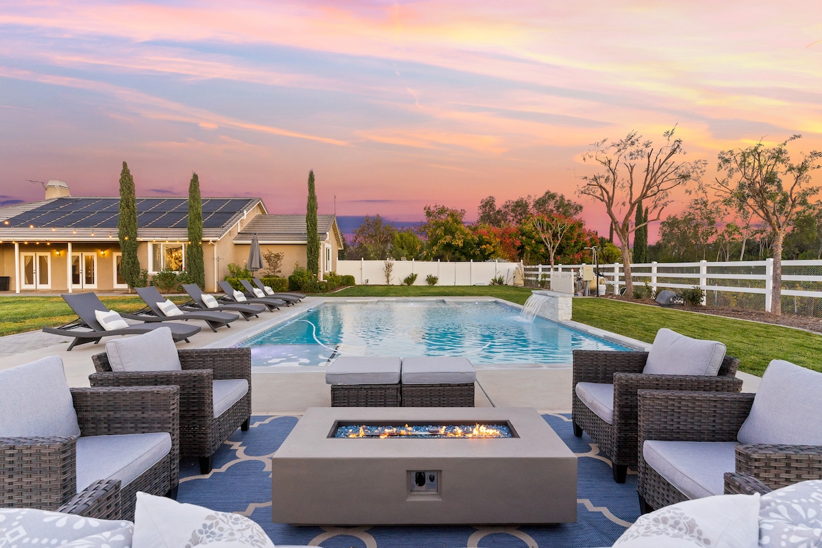Welcome to Belle Volte Estate, a stunning 5,000 sq ft luxury estate set on 5 private acres in the heart of Temecula Wine Country. Ideally located just minutes from Temecula’s renowned wineries and Galway Downs, this expansive property offers breathtaking rolling views, resort-style amenities, and flexible sleeping accommodations for large groups. This Estate includes 4 Primary Suites all with own private bathroom and TV. Pool, Spa, & Fire Pit. Great for 4 to 8 to 17 guests.