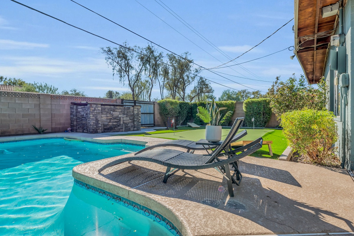 7 mins → Down Town Tempe (cafes, shops, bars, restaurants etc.) 7 mins → ASU 10 mins → Old Town Scottsdale 10 mins → Sky Harbor Airport ✈ ★ "Amazing host! Amazing location! Amazing home! Amazing pool! Amazingly clean!" ☼ Patio w/ BBQ + fire pit + heated pool* ☼ Fully fenced backyard + pet friendly* ☼ Master w/ walk-in shower ☼ King bed in Primary ☼ Smart TV in all rooms ☼ Work Station / Vanity in Bedroom 3 ☼ Ultra plush pillow top mattresses ☼ Putting green ☼ 640 Mbps wifi