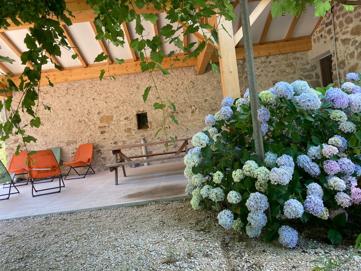 Incantevole alloggio indipendente in pietra, luminoso e ristrutturato con gusto. Ingresso sul soggiorno con divano letto e cucina completamente attrezzata frigorifero congelatore piano cottura forno a microonde macchina per il caffè bollitore utensili da cucina. Scala giapponese che conduce alla camera da letto e un bagno con doccia e servizi igienici. Gli ospiti possono usufruire di uno spazio esterno con tavolo, sedie e sdraio. Un fienile è a vostra disposizione per biciclette, moto ......
