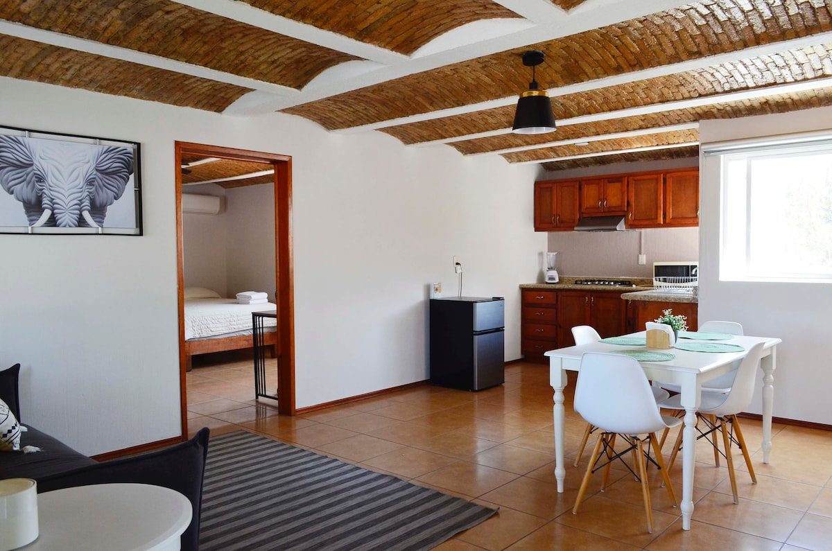 Amplio Loft independiente con aire acondicionado en planta baja , cuenta con una cama matrimonial y un sofa cama individual con todo lo necesario para que tengas una buena estadia. Buena ubicación, a 5 minutos minutos de Walmart, y Centro comercial forum. Caminando varias Farmacias, kiosco, Oxxo, tiendas locales, varios restaurantes y Chedraui , muy cerca de Soriana, Ley, oficina para el pasaporte, central de Autobuses y mucho más. Av. principal (Insurgentes) a dos cuadras.