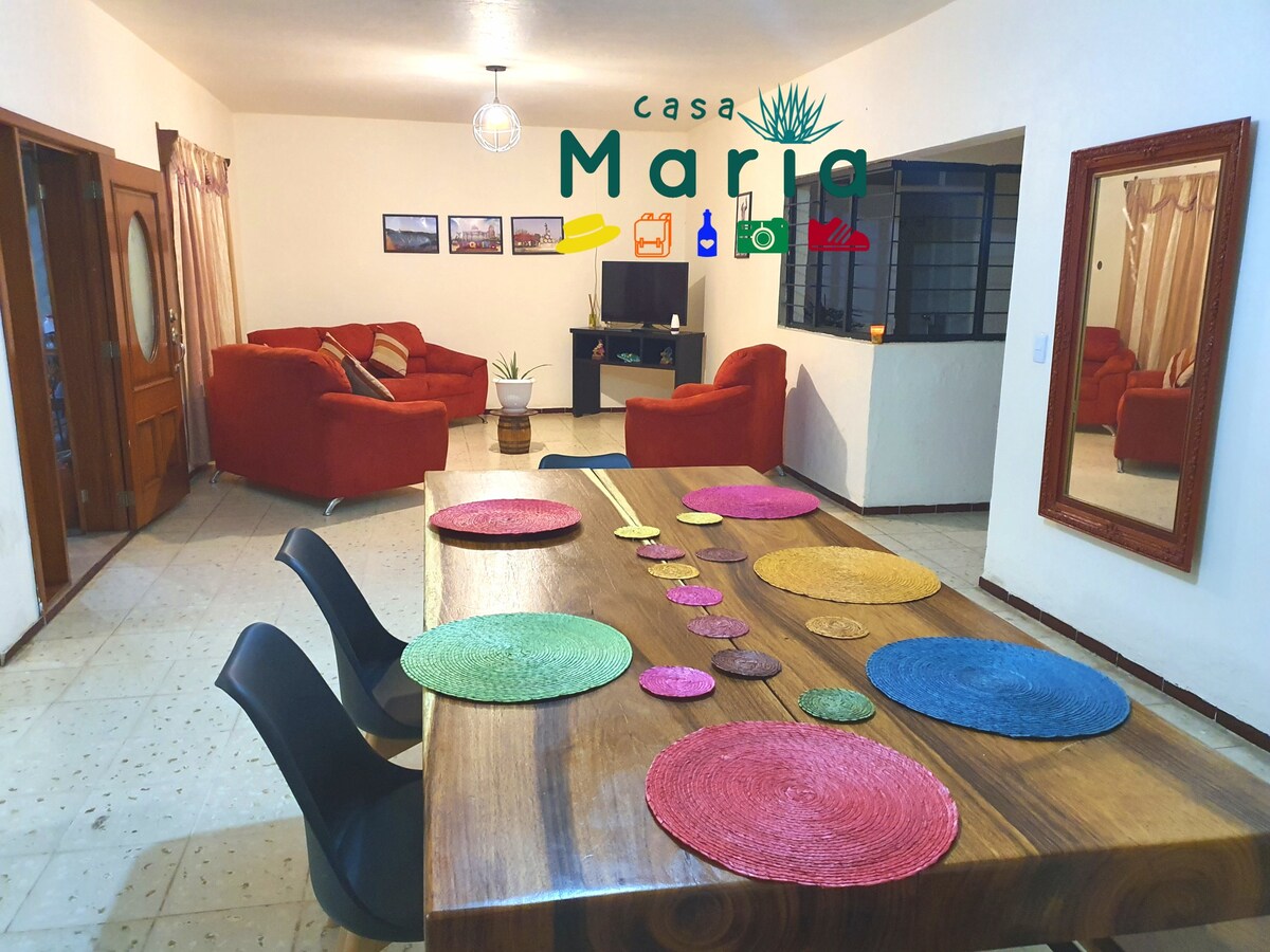 Casa accogliente nel centro di Tequila, a soli due isolati dalla piazza principale. Parcheggio privato per 2 auto con cancello elettrico e ingresso indipendente. Ampi spazi soggiorno, sala da pranzo e cucina, sala TV con wifi e Smart TV. Dispone di 3 camere da letto e 2 bagni completi al secondo piano e 1 camera da letto al piano terra con bagno privato, oltre a un bagno di servizio. Illuminazione naturale e piante che creano un'atmosfera calda e confortevole.