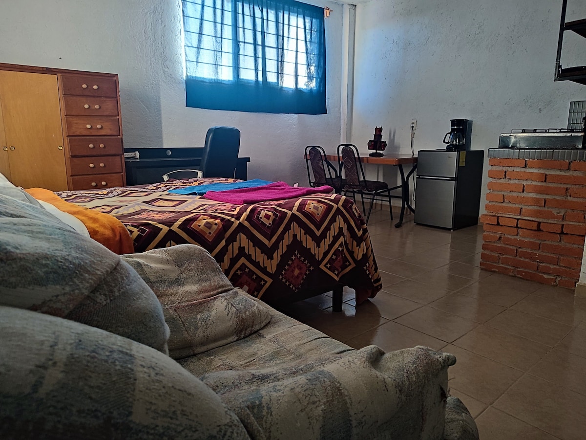 Goditi la semplicità di questo alloggio sul viale principale della colonia. Ideale per professionisti, studenti, insegnanti in visita all'Università di Chapingo. Dispone di una camera con letto matrimoniale, Smart TV. Salotto con angolo cottura con barbecue e gas a disposizione, frigo e microonde. Bagno privato. Al piano terra c'è un negozio varie e una cucina alimentare poco costosa.