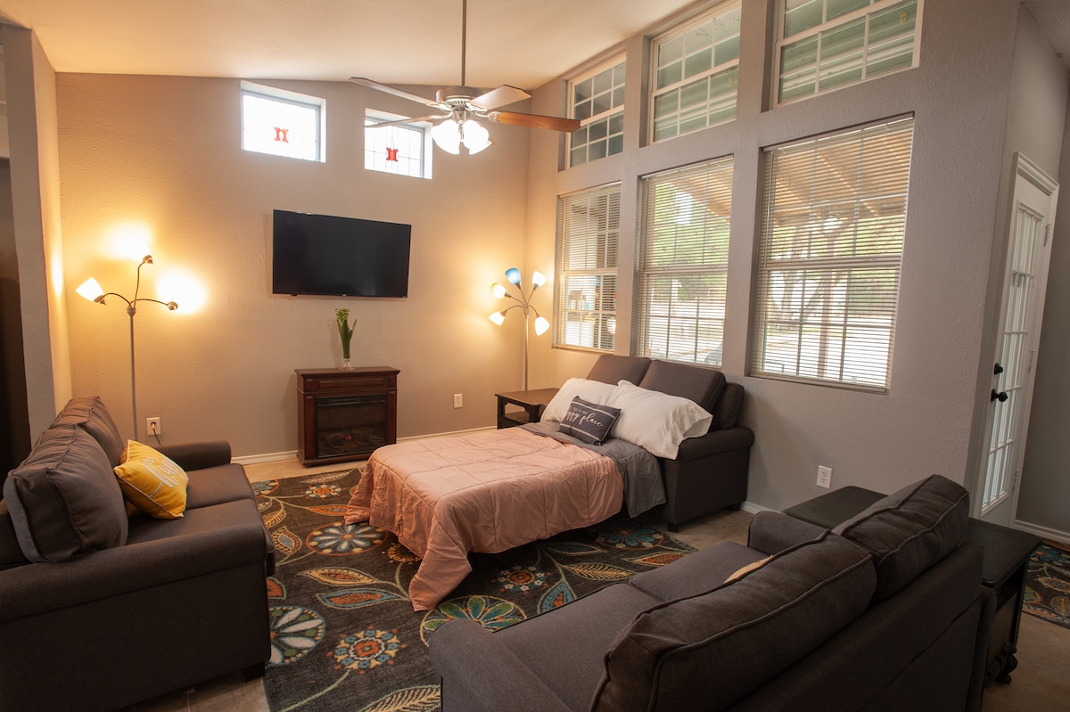 Il nostro piccolo spazio dispone di ingresso indipendente e di un portico privato per sedersi e godersi il tramonto. Circa 51 metri quadrati con molti servizi. Il letto matrimoniale è a scomparsa e può essere ripiegato per offrire più spazio. C'è anche un letto pieghevole, con lenzuola incluse. Questo tipo di letto è ideale per un bambino, un adolescente o un adulto di bassa statura. Abbiamo alpaca, emù, capre, polli, anatre, tacchini, cani e gatti. Lo spazio dispone di frigorifero, forno a microonde, tostapane, pentola, frullatore, lavello e stoviglie.