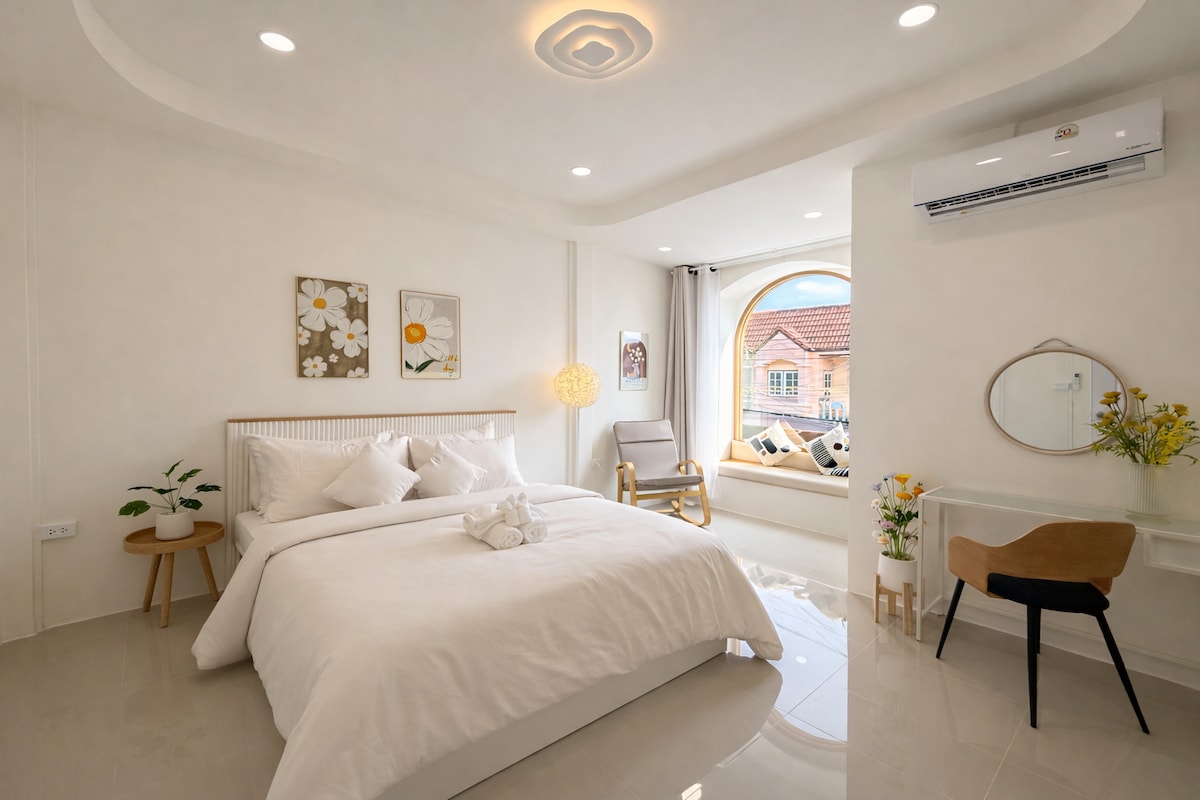 Escape to a beautiful villa with a swimming pool and lush garden. This peaceful, bright, and comfortable retreat is located in a convenient central area, just 15 minutes from Don Muang Airport.Enjoy fantastic on-site amenities, including a tennis table, pool table,volleyball court, ice bath and Boating in the canal . You can relax by the river. Near by : Four 7-Eleven ,CJ Supermarket ,Robinson Mall ,local market ,night market . Your bright and comfortable space awaits in this charming villa.