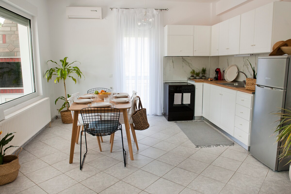 L'appartamento si trova al 1° piano di una casa privata all'inizio della Città Vecchia, con una fantastica vista su Kamares. Completamente ristrutturato nel 2020 con arredi moderni - dotato di cucina/bagno, aria condizionata, lavatrice e ampio balcone renderà il tuo soggiorno indimenticabile!La sua posizione unica è ideale per visitare a piedi le attrazioni della città. Nella zona troverai pittoreschi caffè, bar, ristoranti, supermercati e parco giochi. Saremo felici di ospitarvi!