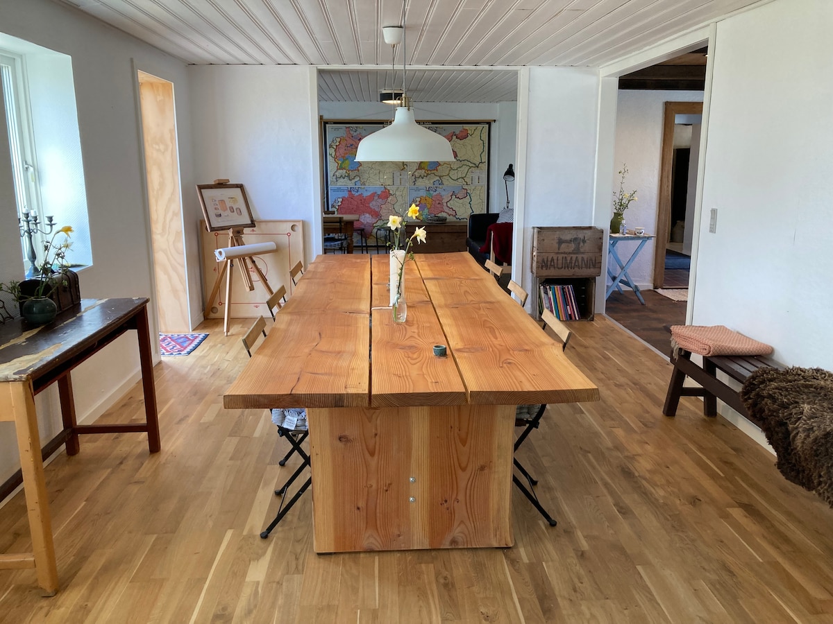 Il vecchio laboratorio è il luogo perfetto per la famiglia. Qui c'è un letto matrimoniale per due adulti e un lettino per il bambino. C'è una scala per il soppalco con 3 letti per bambini da 4 a 14 anni circa. In alternativa, può ospitare 2 adulti. C'è una piccola scrivania, un paio di poltrone, un tavolo e un arredamento accogliente. C'è accesso a una fantastica area esterna con piscina riscaldata (circa 1/5 a 1/10), spa, bagno e una cucina esterna ben attrezzata sulla terrazza coperta, che è condivisa con altri ospiti Airbnb. Un gioiello assolutamente unico a Thy.