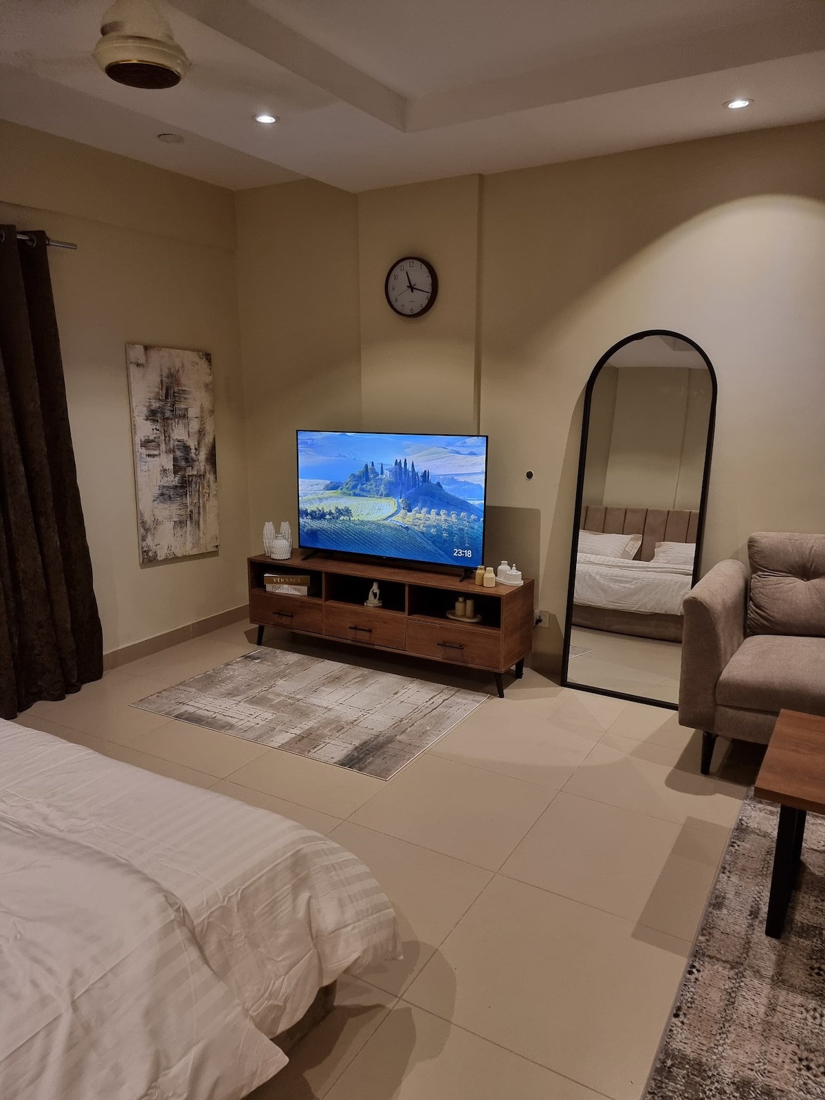 Rilassati e rilassati in questo elegante e accogliente monolocale. Con arredi moderni, un comodo letto matrimoniale grande, un divano e una cucina ben attrezzata, ti sentirai come a casa. Goditi l'intrattenimento sulla TV QLED. Situato nella Torre 2 dei Cube Apartments, Bahria Enclave, Islamabad, con facile accesso a parchi, palestre, caffè e negozi. Perfetta per un soggiorno tranquillo e conveniente.